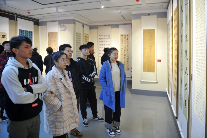 书法是艺术宝库中的瑰宝,学校作为新疆第一所设置书法系的高校,广泛开展交流合作,发挥区内外知名书法家的智库功能,努力弘扬传承书法艺术,积极为培育高素质专业人才贡献力量。本次作品展共展出一百余幅作品,包含了篆、隶、楷、行、草各类书体,作品体现了对伟大祖国的深深祝福和对美好生活的无限热爱,诠释着新艺人永远跟党走的坚定信念和爱国情怀。