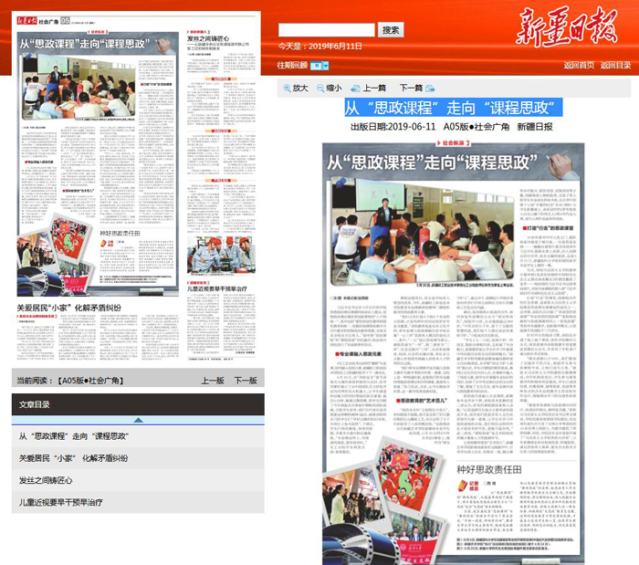 如何使“思政课程”和“课程思政”有机融合?6月11日,《新疆日报》在A05版•社会广角中以《从“思政课程”走向“课程思政”》为题,对我院“课程思政”建设进行了报道。
