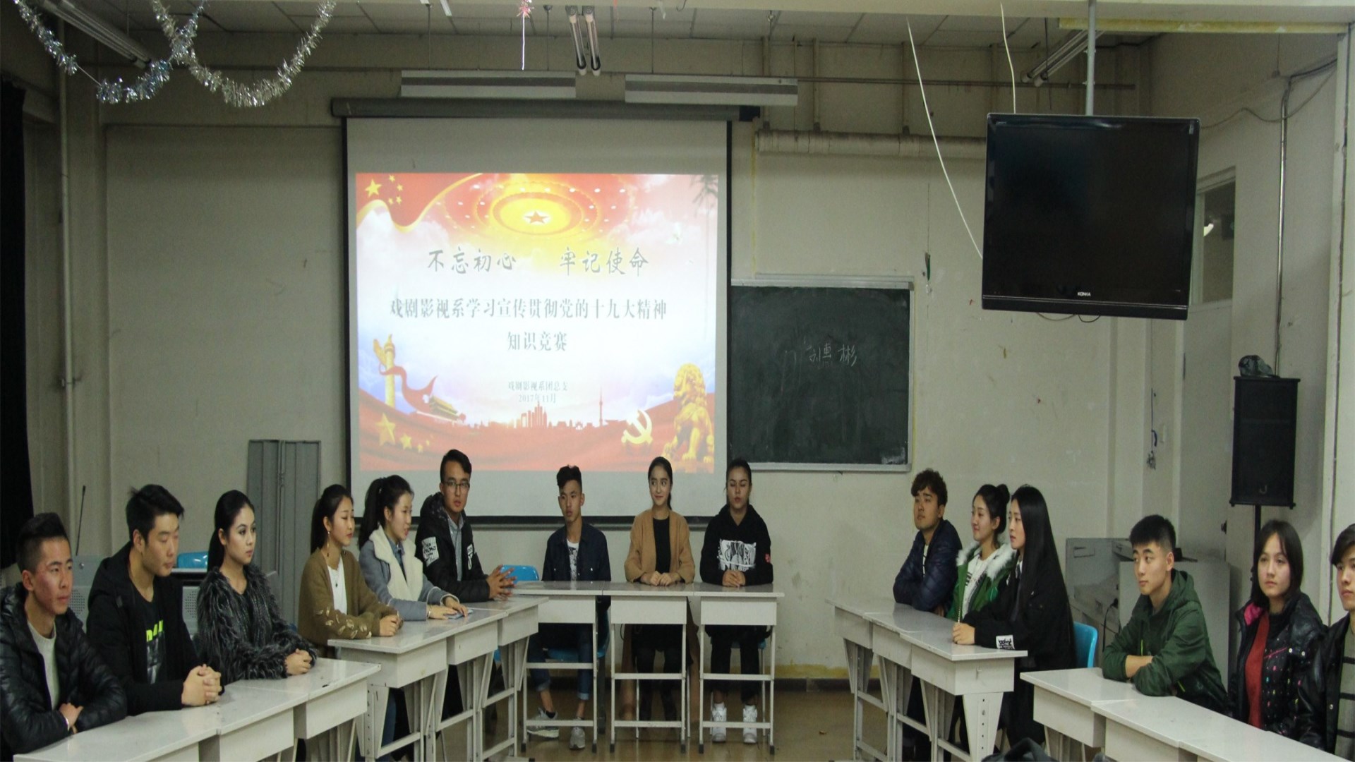 为深入学习宣传贯彻党的十九大精神和习近平新时代中国特色社会主义思想,11月5日下午,戏剧影视系团总支组织2017级全体学生在戏剧楼613教室举办以“不忘初心 牢记使命”为主题的知识竞赛。参赛的同学分为五组,每组三人(民汉学生)。比赛形式分为必答题、抢答题和主观题,以计分制评判比赛。知识竞赛内容包括党的十九大的主题、习近平新时代中国特色社会主义思想的历史地位和丰富内涵、党的十八大以来党和国家事业发生的历史性变革、我国主要矛盾的变化、新时代中国共产党的历史使命、党章修正案以及中央治疆政策等知识点。竞赛中,参赛小组认真思考问题,积极回答问题,通过比赛进一步学习巩固十九大精神的核心内容。场内气氛活跃,比赛形式多样,通过互动环节,观众也投入了充分的热情和积极性,体现了本次竞赛对于同学们学习党的十九大精神的重要意义。通过激烈的比赛,最终由帕丽扎提、宋清淼、于梦雪等3人组成的第五组获得了第一名,第一组和第三组分别获得了第二、三名。