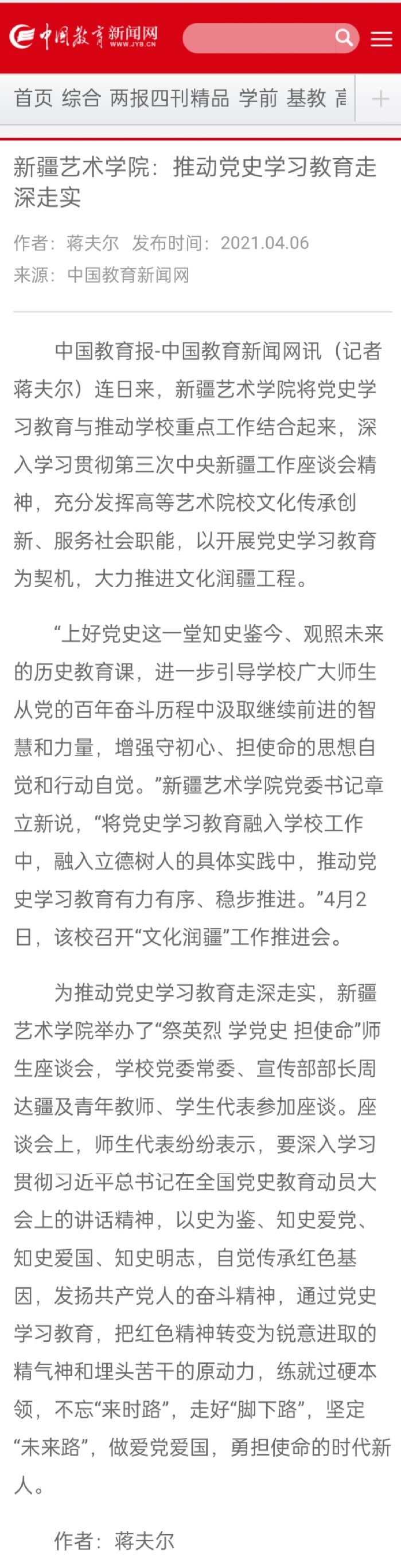 4月6日,【中国教育新闻网】以《新疆艺术学院:推动党史学习教育走深走实》为题,对我校党史学习教育情况进行了报道。
