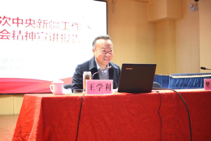 在宣讲报告中,王学利教授从深刻领会第三次中央新疆工作座谈会召开的重大意义、充分认识第二次新疆工作座谈会以来新疆工作取得的重大成就、完整准确贯彻新时代党的治疆方略、扎实推动新疆社会稳定和长治久安的战略部署和重大举措、加强党的全面领导为社会稳定和长治久安提供坚强政治保证、以高度的政治自觉思想行动自觉抓好学习贯彻等六个方面对第三次中央新疆工作座谈会精神进行了全面、系统的阐释解读。