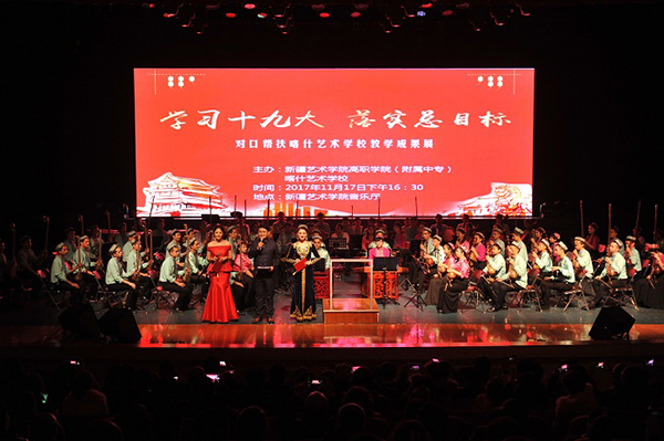 11月17日下午,新疆艺术学院高职学院(附属中专)以“学习十九大,落实总目标”为主题的对口帮扶喀什艺术学校教学成果展在音乐厅隆重上演。两校师生用饱含深情的青春舞步,献上了一场高水平的歌舞盛宴。自治区人大教科文卫工作委员会、自治区文化厅大型活动办、第九批援疆干部、学院领导班子成员及喀什艺术学校领导、高职学院(附属中专)师生代表到场观看演出。