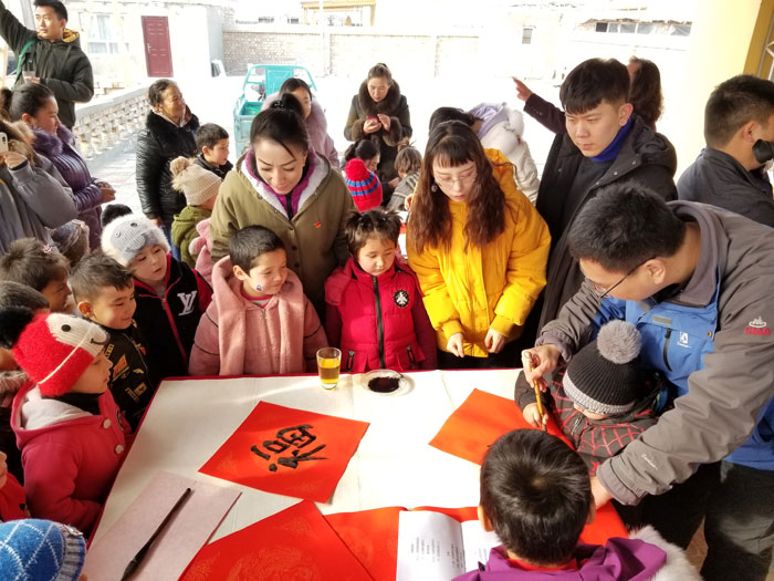 升旗仪式结束后,举办了新疆艺术学院师生助力驻村点脱贫攻坚文化下乡暨民族团结联谊活动。书法系3位老师和8名学生现场挥毫泼墨,用手中的毛笔书写对伟大祖国的美好祝愿,描绘脱贫攻坚的壮丽诗篇。当地村民们主动为师生抻纸倒墨,老师同学们在创作的同时,为村民介绍春联的风俗文化和汉字书法的悠久历史,现场气氛欢乐祥和,其乐融融。学校领导、岳普湖县领导及老师们为村民们赠送了春联、“福”字,并向大家送上诚挚的祝福。